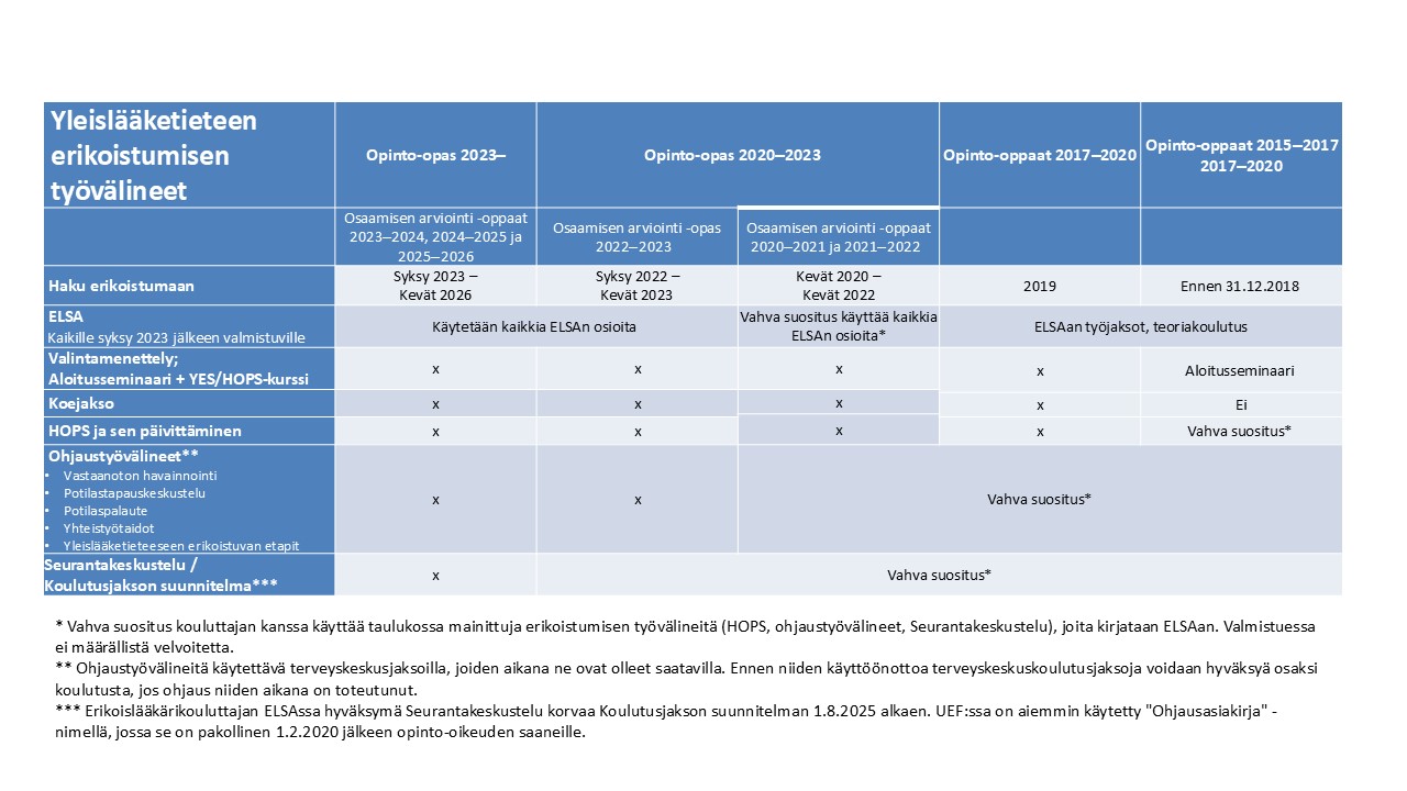 Yllä olevassa taulukossa on koottuna eri opinto-oppaiden vaatimukset eri työvälineiden osalta yleislääketieteessä. Vahva suositus on käyttää kaikkia ohjaustyövälineitä erikoistuessa terveyskeskusjaksoilla riippumatta noudatettavasta opinto-oppaasta.